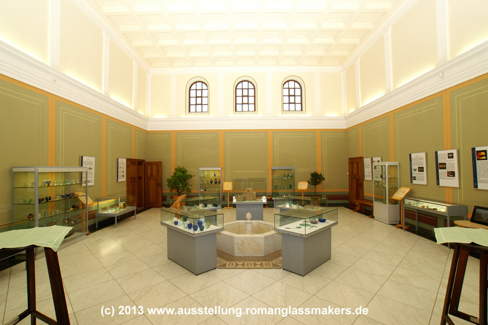Blick in den Ausstellungsraum, die große Enpfangshalle der Villa BorgDiese Ausstellung stellt die wichtigsten Schwerpunkte der Arbeit von Mark Taylor und David Hill vor und zeichnet die Entwicklung ihrer Arbeit in den letzten zwei Jahrzehnten exemplarisch auf. Beide widmen sich seit fast genau 25 Jahren der Erforschung antiker Herstellungstechniken sowie der Herstellung von römischen Replikaten. Durch die von ihnen durchgeführten Glasofenexperimente konnten viele Fragen zur Herstellung römischer Gläser geklärt und veraltete Forschungsthesen revidiert werden.
